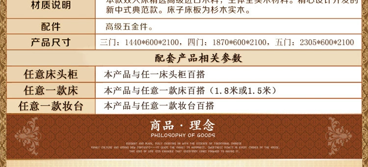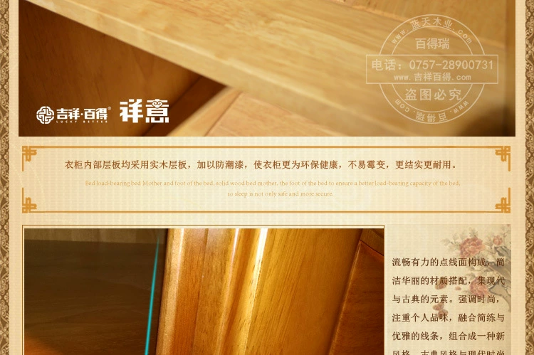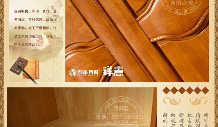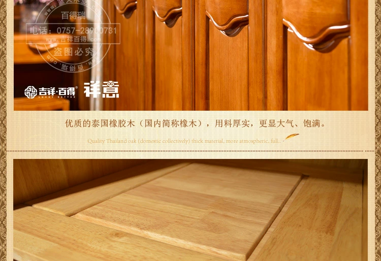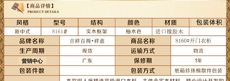 色差:1、本店产品均为实物拍摄,由于拍摄技术、环境光线、显示器色差等诸多因素,收到的实物颜色可有与照片有色差,亲们请以实物颜色为准,不能接受色差的朋友慎购。2、吉祥百得系列家具均为进口橡胶木,纹理、节疤均为天然成形,枝节形成的疤痕不属于质量问题。物流:1、家具属于大件商品,一律使用物流运输,只到当地市区物流点,部分地区物流不能到达,所以拍前请详细咨询客服。2、物流公司一般不送货上门,请买家朋友到当地物流公司提货。3、运费以体积计算,运费标价一元的为运费到付,由于家具的体积和物流的远近不同,价格均需实际计算,发货后一般3——12天到达。签收:1、本店产品都是经过严格检查后才出货的,确保每件产品都为合格产品。2、买家签收时必须核对件数,确保外包装完好无损,如发现外包装破损,请及时联系我们,外包装完好即可提货回家拆箱,如果家具有质量问题请配合拍照,质量问题由我们全权负责。3、家具未安装好前,请保管好包装纸箱,以备退货。售后:1、吉祥百得系列产品为蓝天木业旗下实木家具品牌,保证正品,绝无仿冒,请放心够买。2、先行赔付,本店已加入消费者保障计划,当消费者权利受到侵害时,可以向阿里巴巴提出先行赔付。3、吉祥百得系列产品提供一年的产品保修,正常情况下出现的质量问题,免邮费补发损坏配件。保养:1、避免长期暴晒或置于潮湿的环境中,以免产品褪色。2、不得将过冷或热的东西直接放在家具上,会破坏表面的漆。3、清洁家具使用棉布或软毛刷,不可以使用腐蚀性清洁剂,不可使用硬物擦拭家具表面。4、衣柜、抽屉里面应长期放些樟脑丸,以防虫蛙。5、移动家具时应尽量抬高地面,避免在地面拖行。"