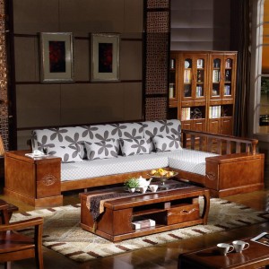 内外家具全实木橡胶木花转角沙发胡桃木色中式布艺沙发6808